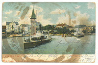 Postkarte Farbige Postkarte; Motiv: Hafen mit Schiff, Lindau am Bodensee; Die Briefmarke wurde entfernt; 2 Poststempel -