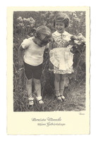 Karte zum Namenstag Postkarte; Zwei Mädchen mit Blumen und einem Brief; die Kleidung und die Pflanzen sind coloriert -