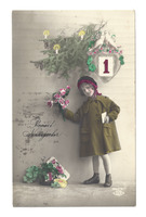 Postkarte Prosit Neujahr Neujahrskarte; Mädchen mit Blumenstrauß unter Tannenzweig; fotografiert und koloriert; gestempelt in St. Gallen -