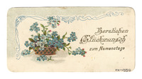 Glückwunschkarten und Postkarten zum Muttertag 01: 4-seitige Karte zum Aufklappen; Motiv auf Titelseite: Blumenstrauß; mit Text "Viele herzliche Grüße zum Muttertag"; 02: 4-seitige Karte zum Aufklappen; Motiv auf Titelseite: Blumenranke mit rosa Herz und Blumen; geprägte, vergoldete Schrift "Zum Muttertag sei mein Gebet: Gott schenk dir Glück, das nie vergeht"; 03: 1-fbg. schwarze Postkarte zum Muttertag; Motiv: Foto einer Blumenvase mit Nelken; Text "Zum Muttertag alles Liebe und Gute!"; 04: im Stahlstich gefertigte Karte zum Muttertag; 05: 4-seitige Karte zum Muttertag; 06: Karte zum Muttertag; Motiv: Blumen und in Gold geprägte Schrift "Meiner lieben Mutter zum Muttertag alles Gute";