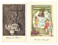 Postkarten Ostergrüße Postkarten; 01: Frohes Osterfest, Küken gemalt; 1937-03-27, gestempelt in Bregenz; 02: Ein frohes Osterfest!, Glocke gemalt, 1937-03-23, gestempelt in Feldkirch; 03: Fröhliche Ostern, Kapelle Fotografie, schwarzweiß, 1935-04-19, gestempelt in Wien; 04: Gesegnete Ostern - Kreuz mit betender Frau, Fotografie; 1937-03-25, gestempelt in Dornbirn; 05: Gesegnete Ostern, Kreuz am Weg, gemalt von Ch. v. Schwind, 1950-05-18, gestempelt in Dornbirn; 06: Gesegnete Ostern!, Kreuz und Blumenstrauß, 1947, gestempelt in Wien; 07: Die besten Ostergrüße!, Engel gemalt; -
