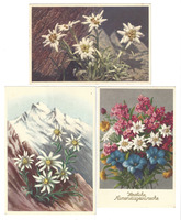 Postkarten: Edelweiß 01: Karte; Motiv: Fotografie mit fünf Edelweiß am Felsen; 02: Karte; gezeichnetes Motiv: sechs Edelweiß; dahinter schneebedeckte Berge mit hellblauem Himmel; 03: Farbige Karte; Motiv: Blumenstrauß mit Edelweiß, Almenrausch und Enzian; -