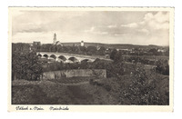 Postkarte Volkach a. Main Mainbrücke Postkarte; Mainbrücke Volkach a. Main; Fotografie schwarzweiß; geschrieben mit Schreibmaschine; händisch unterschrieben; gestempelt in Bezau -