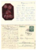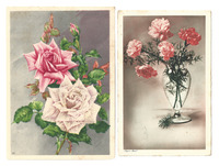 Postkarte Blumen 01: nachcoloriertes Bild von fünf Blumen in einer Glasvase; unten ist "Begro Apart" aufgedruckt; Abgestempelt am 1937-02-15 in Hittisau; 12-Groschen-Briefmarke; 02: Abgebildet sind eine weiße und eine rosafarbene Rose mit grünen Blättern und Knospen; Abgestempelt am 1950-08-03 in Bregenz; 30-Groschen-Briefmarke (Salzburg Pongau); -