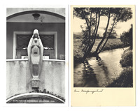 Postkarte Mehrerau 2 Postkarten 01: Schwarz-weiß-Fotografie einer Madonnenstatue im Sanatorium Mehrerau; Abgestempelt am 1940-06-15 in Bregenz; Deutsches-Reich-Briefmarke; 02: Schwarz-weiß-Fotografie eines Baches mit Wiesen und von Wolken verdeckten Bergen dahinter, betitelt mit "Im Wiesengrund"; Abgestempelt am 1953-10-16 in Bregenz; 1-Schilling-Briefmarke der Republik Österreich -