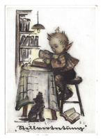 Postkarte Stellvertretung Postkarte; Die Bildseite hat eine bunte Zeichnung von einem Kind am Tisch, das in einem Buch blättert; Abgestempelt wurde die Karte am 1940-05-28 in Bregenz; Briefmarke des Deutschen Reiches; An den Rand des Nachrichtentext ist etwas geschrieben, vermutlich in Steno; -