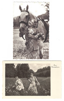 Postkarte Beim Blumenpflücken, und Frau mit Pferd 01: Schwarz-weiß-Fotografie einer Frau mit Pferd, die einen Blumenstrauß im Arm hält; Abgestempelt in Andelsbuch; zwei 6-Groschen-Briefmarken; 02: schwarz-weiß-Fotografie von zwei Frauen, die Blumen pflücken, betitelt mit "Beim Blumenpflücken."; Abgestempelt am 1937-05-19 in Hohenweiler; 12-Groschen-Briefmarke; -