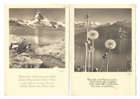 Postkarte Bild und Spruch Zwei Postkarten; 01: schwarz-weißes Foto von verblühten Löwenzahn vor einem See und einer Berglandschaft; Darunter steht "Gott läßt wohl Blumen sterben / Und Sonnen sich verglühn; / Doch nichts läßt er verderben, / Neu wird es auferblühn. / Fink"; Abgestempelt ist die Karte in Bezau am 1941-02-17; Deutsches-Reich-Briefmarke; 02: schwarz-weißes Bild eines Sees vor einem Berg; Spruch "Wenn am Schemel seiner Füße / und am Thron schon solcher Schein, / o, was muß an seinem Herzen / erst für Glanz und Wonne sein!"; Abgestempelt in Hittisau am 1941-05-02; Deutsches-Reich-Briefmarke -