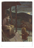 Postkarte Feierabend Schiestl Postkarte; Druck eines gemalten Bildes (Schiestl: Feierabend); Die Karte wurde am 1938-02-11 in Dornbirn abgestempelt; 12-Groschen-Briefmarke (Oberösterreich) -