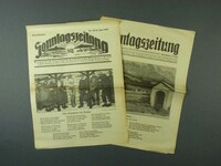 Zeitung: "Sonntagszeitung" 19 Sonntagszeitungen (FM-776-01 bis FM-776-19) Vorhanden sind: Nr.27, 1939-07-02; Nr.28, 1939-07-09; Nr.29, 1939-07-16; Nr.30, 1939-07-23; Nr.22, 1940-06-02; Nr.23, 1940-06-09; Nr.24, 1940-06-16; Nr. 25, 1940-06-23; Nr. 26, 1940-06-30; Nr. 27, 1940-07-07; Nr. 42, 1940-10-15; Heft FM-776-11 auf Seite 5 ein interessanter Artikel "Das Bild der Mutter". Nr. 43, 1940-10-22; Nr. 4, 1942-01-26; Nr.5, 1941-02-02; Nr.9, 1941-03-02; Nr.8, 1941-02-23; Nr.11, 1941-03-16; Nr.10, 1941-03-09; Nr. 12, 1941-03-23; Nr.13, 1941-03-30; -