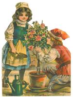 Zeitungsausschnitt Zeitungsausschnitt, der einen Jungen und ein Mädchen zeigt, die ein Rosenbäumchen in einen Topf gepflanzt haben; Es steht eine grüne Gießkanne daneben; das Bild ist den Konturen nach ausgeschnitten, auf der Rückseite befindet sich ein Gedicht über die "geschickte Lilly".