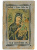Büchlein: "Andacht zu Unserer Lieben Frau von der immerwährenden Hilfe." geklammertes Andachtsbüchlein; Vorne ist eine Marienikone (Eleusa) aufgeklebt, die nicht mehr so gut befestigt ist. -