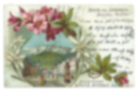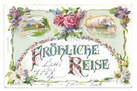 Postkarte von Großmutter Fink an Julius Salzmann Farbige Postkarte mit Prägedruck; Blumenornamente; Eisenbahn; Postkutsche; Schiff. 5 Heller Briefmarke mit zwei Poststempeln, Krumbach und Hittisau -