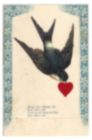 Postkarte von Barbara an Julius Salzmann farbige Postkarte. Mit aufgeklebten Lackbildern, einer Schwalbe mit einem rotem Herz im Schnabel und einem Rahmen mit Blumenmotiv im Prägedruck. 5 heller Briefmarke mit 2 Poststempeln. -