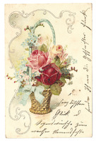 Postkarte Rosenstrauß Postkarte von den Geschwister Fink an Julius Salzmann sen. mit Gratulation zum Namenstag; Rosenstrauß gemalt; gestempelt in Krumbach und Dornbirn -