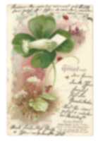 Postkarte Farbige Postkarte mit Pflanzen und Kleeblatt; Im Kleeblatt ist eine Hand zu sehen, die einen Brief hält. 5 Heller Briefmarke mit Poststempel Krumbach. -