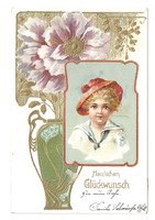 Postkarte an Julius Salzmann Farbige Postkarte mit vergoldetem Prägedurck. Blumen und Herz. 5 Heller Briefmarke mit 2 Poststempeln. -