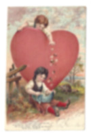 Postkarte an Julius Salzmann Farbige Postkarte mit einem Prägedruck; einem rotem großen Herz; zwei Kinder; 5 Heller Briefmarke, zwei Poststempel von Dornbirn und Sulzberg -