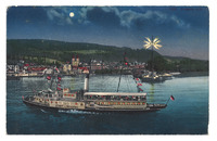Postkarte Bregenz und Bodensee Postkarte; Farbbild von einem Schiff am Bodensee mit der Stadt Bregenz im Hintergrund; Abgestempelt in Bregenz am 1925-04-27 -