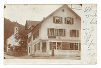 Postkarte Gemischte Warenhandlung von Katharina Meßmer Auf der Postkarte ist die "Gemischte Waarenhandlg. von Katharina Meßmer" abgebildet. Daneben ist etwas geschrieben, das jedoch sehr unleserlich ist, da das Fotopapier wasserabweisend ist. -
