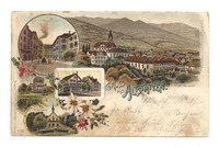 Postkarte Altstätten Auf der Postkarte sind vorne diverse gezeichnete Bilder von Altstätten aufgedruckt (Kloster Maria-Hilf, Kirchenplatz, Anstalt zum guten Hirten, Post, Forstkapelle). -