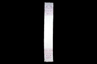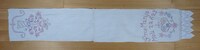 Tischläufer rot bestickt; grober Stoff mit roten eingewobenen Streifen; Blumen; Stielstich, Plattstich, Schlingstich, an den Enden jeweils mit Spitzen; Sprache? Achtung: Spruch vielleicht nicht richtig wiedergegeben. Sonderzeichen fehlen; Kada c vijetak / Uro sicisja / Uzelenoj / UZeleNoj / SuMICI, RaDO, / Secemja, -