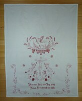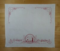 Versehtuch Motiv: Jesus am Kreuz, zwei Engel, Ähren, Lamm Gottes; rot bestickt; Plattstich, Stielstich, Hohlsaum; Spruch: "Wenn uns Herz und Auge bricht / Dann, o Herr, verlaß uns nicht!" -