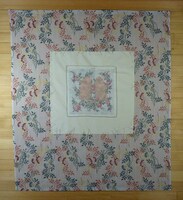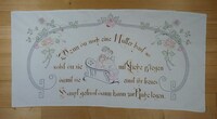 Wandbehang Motiv: Mutter und Tochter umarmen sich; Blumengirlande; gelb, dunkel und hellrot, gelb, grün, rosa, schwarz, blau, braun bestickt; Spruch: "Wenn du noch eine Mutter hast so / solst du sie mit Liebe pflegen / damit sie einst ihr treues / Haupt getrost dann kann zur Ruhe legen." -