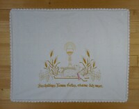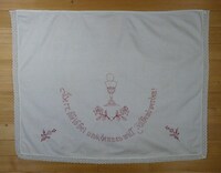 Versehtuch gold, orange, gelb, rot bestickt; Motiv: Osterlamm, Ähren, Weinreben; mit Spitzen eingefasst; Spruch: "Unschuldiges Lamm Gottes, erbarme dich unser." -