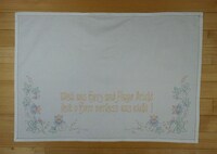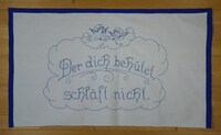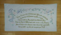 Tischläufer bunt bestickt; Blumenbouquets, Engel; auch Spruch mehrfarbig; eingesetzte Spitze, an den Enden jeweils mit Spitze; Sprache Bosnisch? Achtung: Spruch vielleicht nicht richtig wiedergegeben. Sonderzeichen fehlen; Spruch: " "DOBRO JUTRO TATA" / Otvovite snahi prata, ona nosi mnogo / Sreče / avi njoji sutra cveće." und auf der anderen Seite " "ZIVIO" / Zivijo zivijo!! kojga / bude primijo primit čega zlato, / moje alsat znadem koje." Bedeutung (ungefähr): " "Guten Morgen Papa" / ........ Schwiegertochter ....., sie trägt viel / Glück / ... ihr Blumen morgen." und auf der anderen Seite " "Er lebte" / sie leben sie leben!! Die sie / ... erhalten von Gold werden, / ich weiß dass meine ...." -