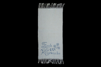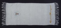 Überhandtuch In Stoff eingewebtes Motiv: Schwäne und florale Umrandung; gelb, blau bestickt; Initialen: ??? „R“ steht wahrscheinlich für Reis oder Riedmann; Spruch: "Guten Morgen!" -