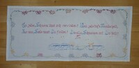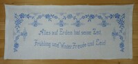 Wandbehang Kreuzstich; blau bestickt; links und rechts und oben Hohlsaum; unten und oben Plastikringe; Spruch: "Alles auf Erden hat seine Zeit, / Frühling und Winter Freude und Leid" -