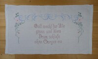 Wandbehang in grün, rosa, braun, hellblau besticktes Leinen; links und rechts Hohlsaum; Kreuzstich; Spruch: "Gott wacht für Alle / gross und klein / Drum schlafe / ohne Sorgen ein" -