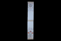 Tischläufer Kettenstich, Stielstich; rot, blau, grün bestickt; Abschluss mit Spitzen; grobes Tuch; Motiv: Blumenranken, Herz mit Kreuz; Spruch: "Scre Marije / Moli za nas" (wahrscheinlich slowenisch, evtl. nicht richtig wiedergegeben - "Srce Marijino, moli za nas" - ... Maria, bitte für uns?) -