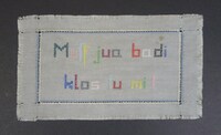Spruchtuch hellgrau/blauer Stoff; Kreuzstich; bunt bestickt; Spruch: "Muff jua badi / klos tu mi!"