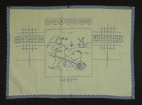 Wandschoner Blau gestickter Wandschoner, der mit einem blauen Band eingefasst ist. Motiv in der Mitte des Tuches, umgeben von verschiedenen Blumen- und Strichmustern. Hauptmotiv: Im Vordergrund ist ein Zwerg zu sehen, der einen Schubkarre, beladen mit zwei Säcken, schiebt. Er trägt einen Zipfelmütze und hat eine Blume aus dem Mundwinkel hängen. Im Hintergrund ist eine Windmühle zu sehen, die an einem See oder Fluß steht, auf dessen Horizont ein Segelboot erkennbar ist. -