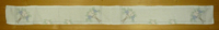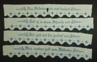 Spruchband, vierteilig Vier-teiliges Spruchband in zwei verschiedenen Blautönen bestickt. Der unterer Rand ist mit Schlingstich eingefasst. Text: "Was Mütterlein mir einst beschert / Halt ich in diesem Schranke wert / Wie's einstens hielt mein Mütterlein. / Soll glatt und fein geordnet sein". Der Text ist von Ornamenten umgeben. In der Mitte des ersten Bandes befindet sich ein großes Loch. -