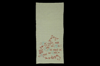 Handtuch Die untere Hälfte des Handtuchs mit einem Spruch mit rotem Faden bestickt, wobei die Großbuchstaben jeweils blau sind. Spruch "Nur einmal blüht / im Jahr der Mai, / Nur einmal im / Leben die Liebe". Um den Spruch schlängeln sich florale Girlanden. -
