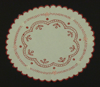 Deckchen Rot besticktes rundes Deckchen, das mit Schlingstich eingefasst ist. Dargestellt sind unter anderem floralen Motive. -