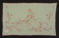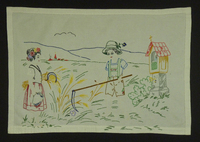 Wandschoner Nicht fertige, bunt gestickte Darstellung einer Szene auf dem Feld. Die Motive sind mit Stielstich gestickt. Im Vordergrund sind ein junger Mann mit Sense, ein Mädchen mit Sichel und Krug in der Händen und ein Bildstock zu sehen. Der Mann trägt einen Hut und die Frau einen Blumenkranz auf dem Kopf. Im Hintergrund sind Hügel und ein paar Häuserdächer eines Dorfes zu erkennen. Die Szene ist nicht fertig gearbeitet, so fehlen die Parts, die mit Hautfarbe gestickt werden sollten, etwa Arme und Füße der Figuren. -