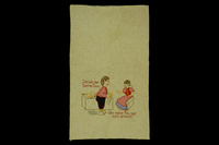 Spruchtuch Bestickter Kissenbezug, der nicht vernäht wurde. Das Motiv besteht aus zwei Igelfiguren (Meckis). Die männliche Igelfigur steht an einer Komode (?) und trocknet Geschirr ab, während die weibliche Igelfigur auf einem Sessel sitzt und dem männlichen Igel zuschaut. Der Spruch steht zweigeteilt: " Ich bin der / Herr im Haus / Was meine Frau sagt / wird gemacht". -