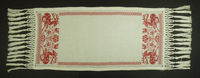 Überhandtuch Rot besticktes Leinentuch, das mit einem Hohlsaum eingefasst ist und am unteren und oberen Ende mit Makramee-Fransen verziert ist. Dargestellt sind Kreuzstichstickereien mit Tier- und Blumenmotiven. -