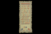 Mustertuch Mustertuch in den Farben rot und blau bestickt. Es ist auf allen Seiten mit Fransen verziert. Die Motives sind mit Kreuzstich gestickt, teilweise etwas schlampig, und zeigen: Alphabet in zwei verschiedenen Schriften, JM Initialien, 1897. -