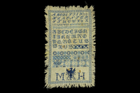 Mustertuch Mustertuch bestickt mit blauem Garn und auf allen Seiten Fransen. Die Motive sind mit Kreuzstich gestickt und zeigen: Alphabet in zwei verschiedenen Schriften, Zahlen, Ornamente. Am unteren Ende des Tuches befinden sich die Initialien MH und das Wappentier Adler. -