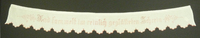 SpruchtuchReligiöses Spruchtuch; rot bestickt; Stielstich; Plattstich; mit Spitzen eingefasst; Spruch: "O, heilige Maria / bitt für uns!"