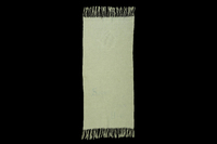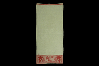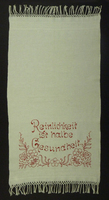 Tuch Gemustertes Tuch mit einem schmalen roten Zierstreifen oben und einem breiteren Zierstreifen unten. An der oberen Kante befindet sich eine Schlaufe zum Aufhängen. Am unteren Ende, vor dem Zierstreifen befindet sich die Initialie "R". Auf dem unteren Zierstreifen sind Weinreben und der Spruch: "Rein ist / Fein". -
