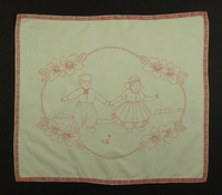 Wandbehang Rosa bestickter Wandbehang, der mit einem rotem Zierband eingefasst ist. Das von Blumenranken umgebene Motiv zeigt eine Frau und einen Mann, die sich an den Händen halten. -