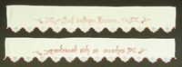 Spruchband, zweiteilig Zweiteiliges rot und blau besticktes Spruchband. Der untere Rand ist gerundet und mit Schlingstich eingefasst. In den Rundungen befindet sich jeweils ein Blumenmuster. Auf beiden Bändern befindet sich jeweils ein Teil des zusammengehörenden Spruches, der links und rechts von floralen Verziehrungen eingefasst wird: "So weiß wie Schnee, / Ach’ und Weh!" -