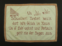 Wandbehang Ein rot bestickter Wandbehang, der mit einem Zierband eingefasst ist. Die Motive sind mit Plattstich gestickt und zeigen zwei Schwalben, einen Ausschnitt von Haus und den Spruch: "Wo / Schwalberl Nesterl bau'n / dort ist's Glück im Haus / Wo d'Lieb' wohnt und Vertau'n / geht nie der Segen aus". -