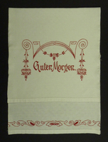 Überhandtuch Ein mit rotem Stielstich- und Plattstich besticktes Handtuch, das oben und unten mit einem Hohlsaum eingefasst ist. Auf einer der Hälften steht der Spruch "Guten Morgen", der von einer architektonisch und floralen Verzierung umrahmt wird. -